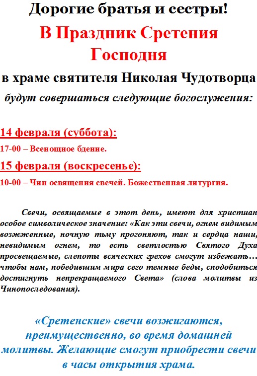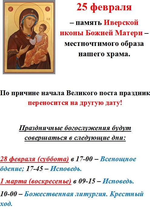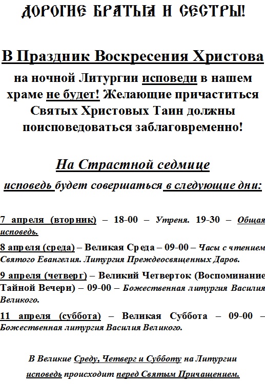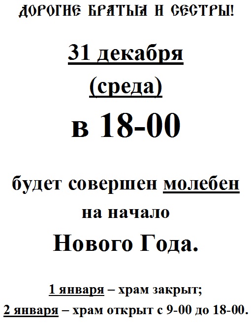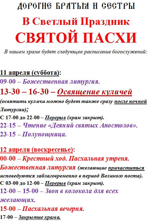 (Во время совершения богослужений, согласно общему расписанию, храм открыт дополнительно. В Двунадесятые и Престольные праздники – храм открыт с 9-00 до 18-00).