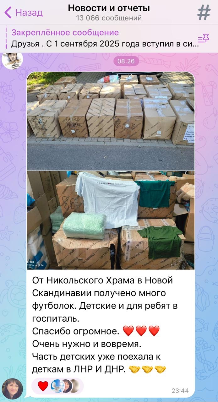 28 сентября 2025 года отправили 14 коробок с футболками в приграничные области для мирного населения и в госпитали совместно с организацией «Народный Фронт».