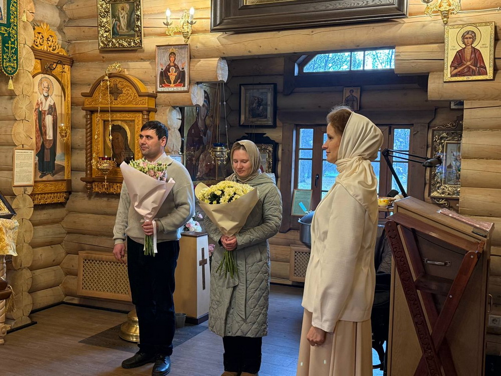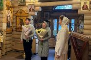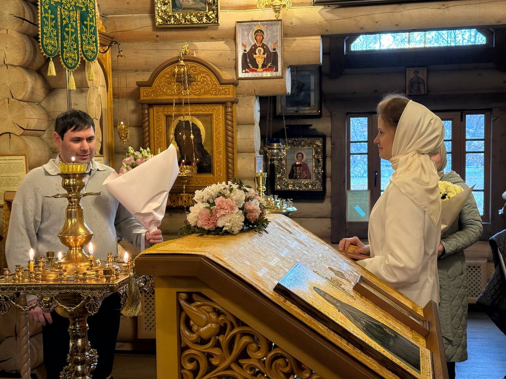 Многие прихожане, несмотря на рабочий день, также пришли помолиться на Литургии о здравии отца Александра и матушки Анны, в конце вручив им букеты прекрасных цветов.