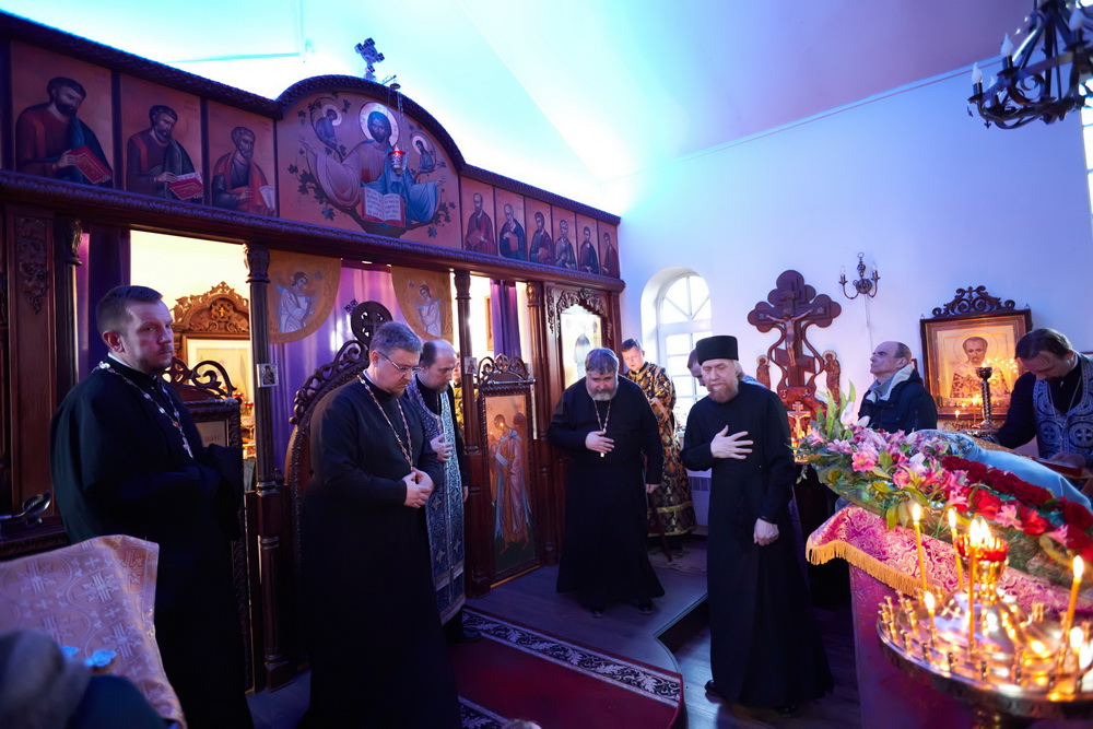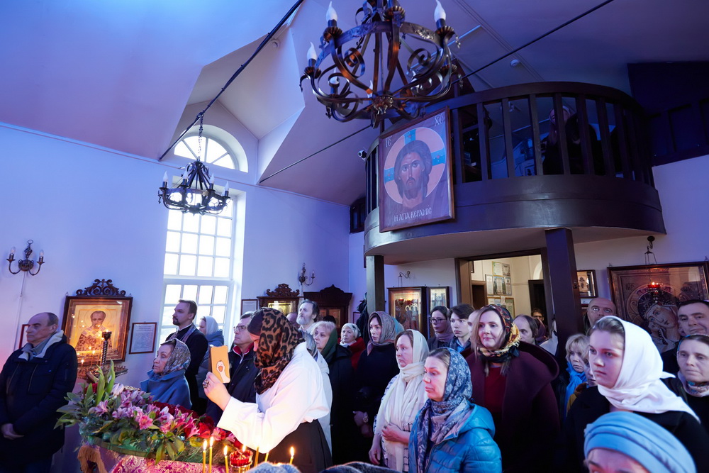 Возглавил богослужение настоятель храма протоиерей Алексий Суслов. Пояснения в ходе богослужения давали клирик храма иерей Димитрий Дмитриев, настоятель храма Рождества Николая Чудотворца в Шушарах иерей Александр Иванов, клирик Михайловского храма в Старо-Паново Александр Рожманов, настоятель храма-часовняи св. ап. и ев. Луки на Соляном переулке в Санкт-Петербургской Государственной Художественно-промышленной академии иерей Илия Павлов, настоятель храма свт. Николая Чудотворца в ЖК «Новая Скандинавия» иерей Александр Гинкель.