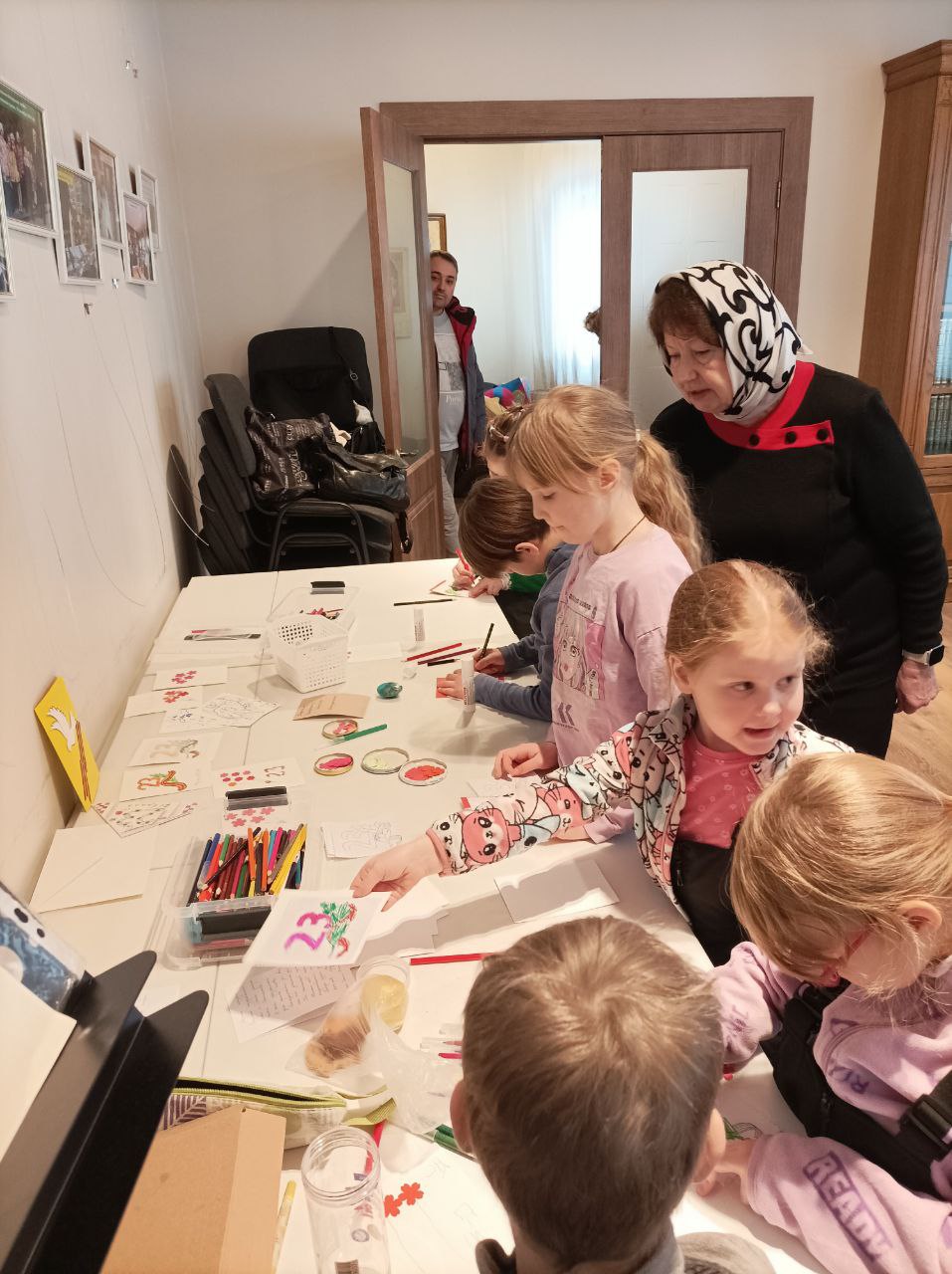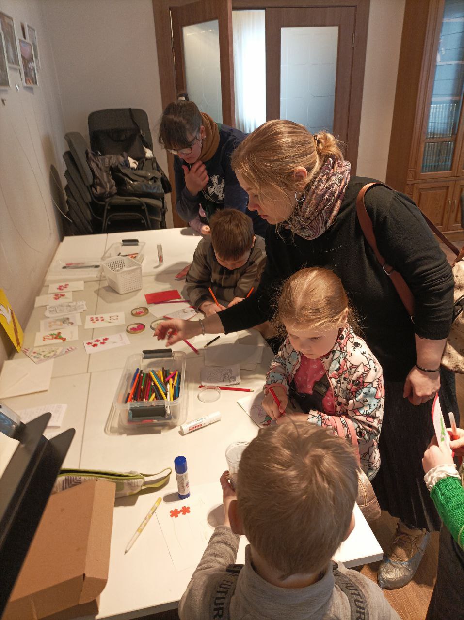 22 февраля 2026 года после Божественной литургии и традиционного детского чаепития учащиеся Воскресной школы Свято-Никольского храма в ЖК «Новая Скандинавия» г. Санкт-Петербурга и их родители приняли участие в добром деле — изготовлении открыток для солдат в госпиталь Военно-медицинской Академии.