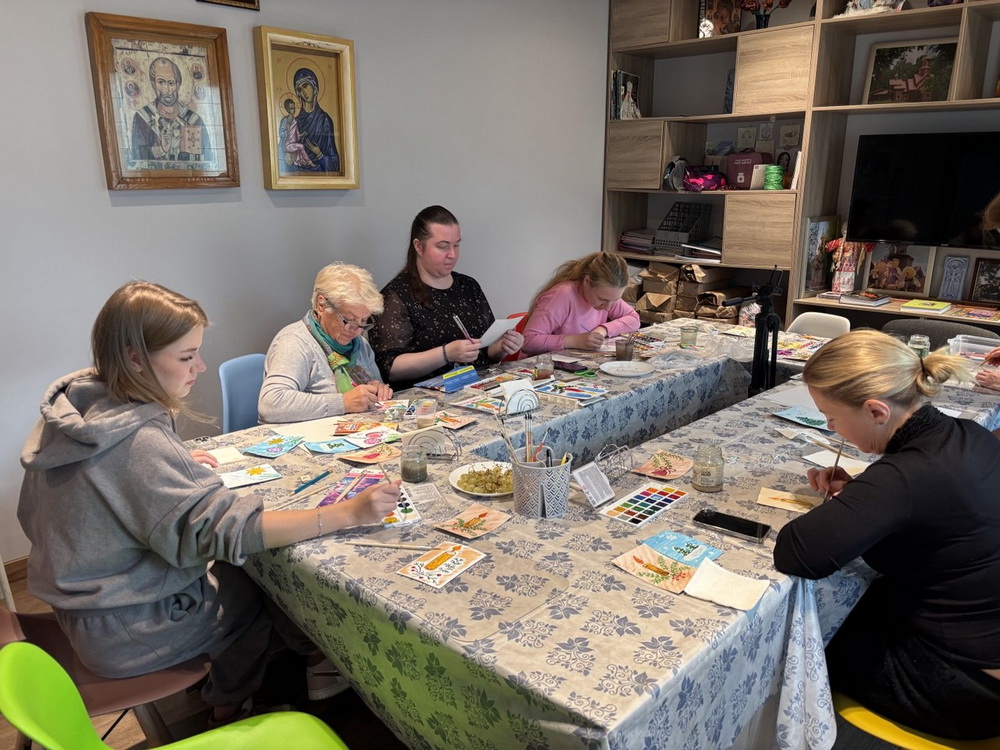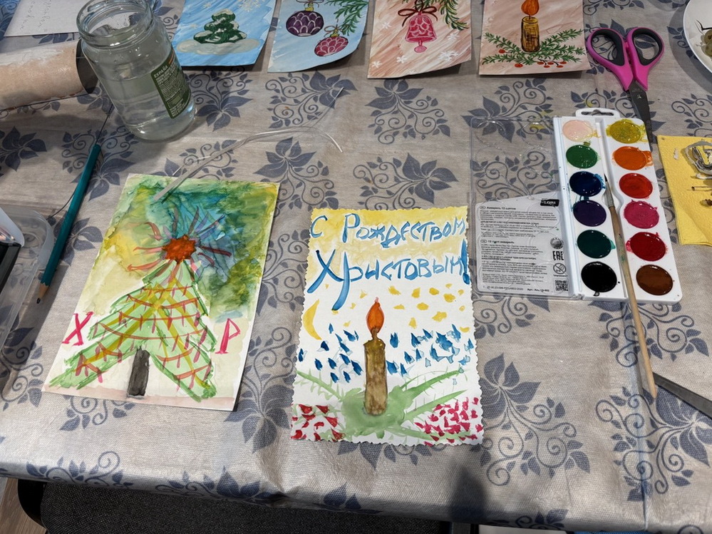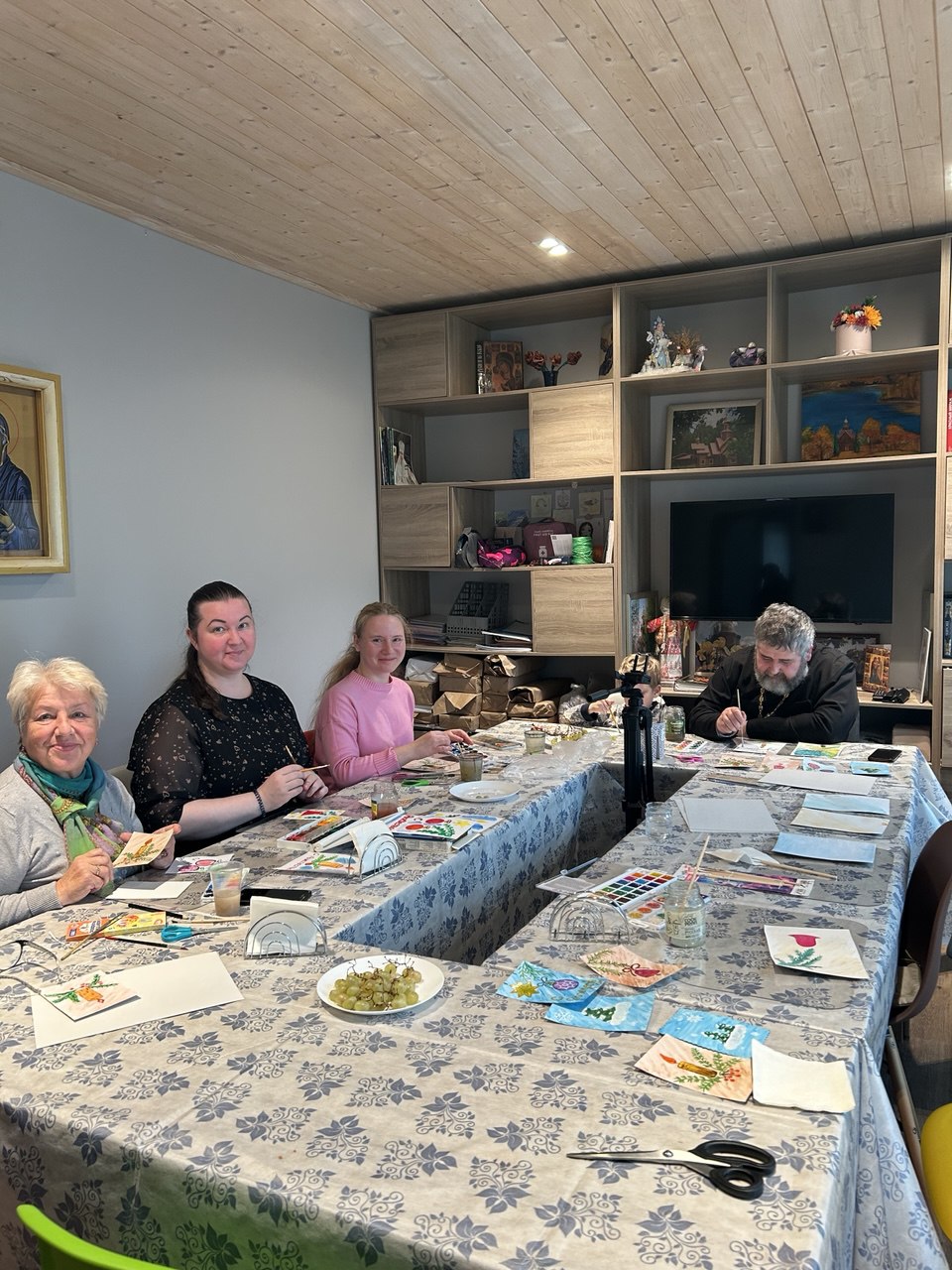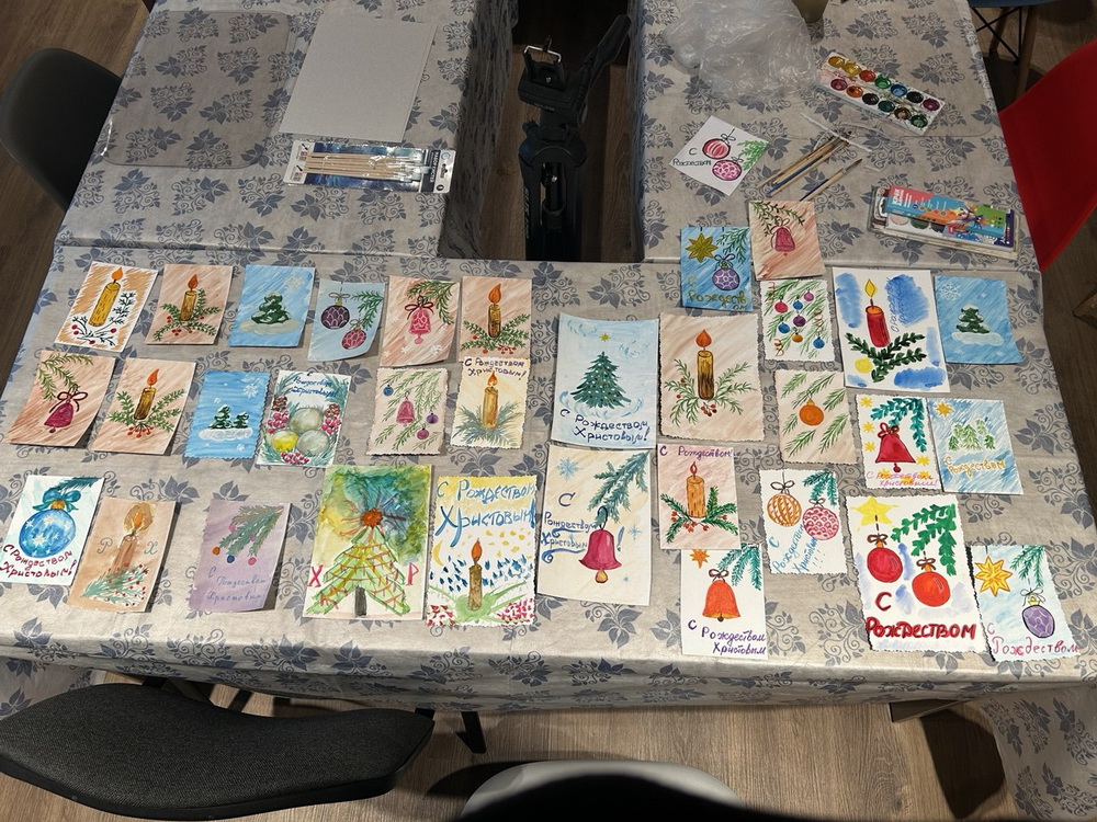 19 октября 2025 года на очередной встрече приходского клуба «Дорога к Богу» был проведен мастер-класс по рисованию на тему: «Открытки к Рождеству Христову». Пришедшие художники — как профессионалы, так и любители, — рисовали открытки к предстоящему Празднику Христова Рождества для их последующей отправки с гуманитарной помощью на фронт.