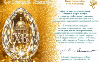 В Праздник Светлого Христова Воскресения настоятелю иерею Александру Гинкель и прихожанам Свято-Никольского храма Пасхальное Поздравление направил благочинный Выборгского округа Санкт-Петербургской епархии и ключарь Исаакиевского собора протоиерей Роман Ковальский. «Пасха... Читать далее →